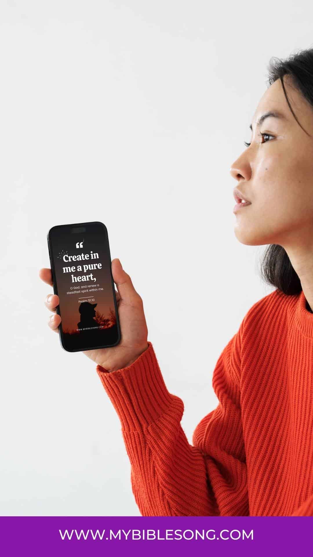 Our stunning digital wallpaper will inspire your mobile or home décor. It features the uplifting Bible verse, Psalm 51:10: “Create in me a pure heart, O God, and renew a steadfast spirit within me.”