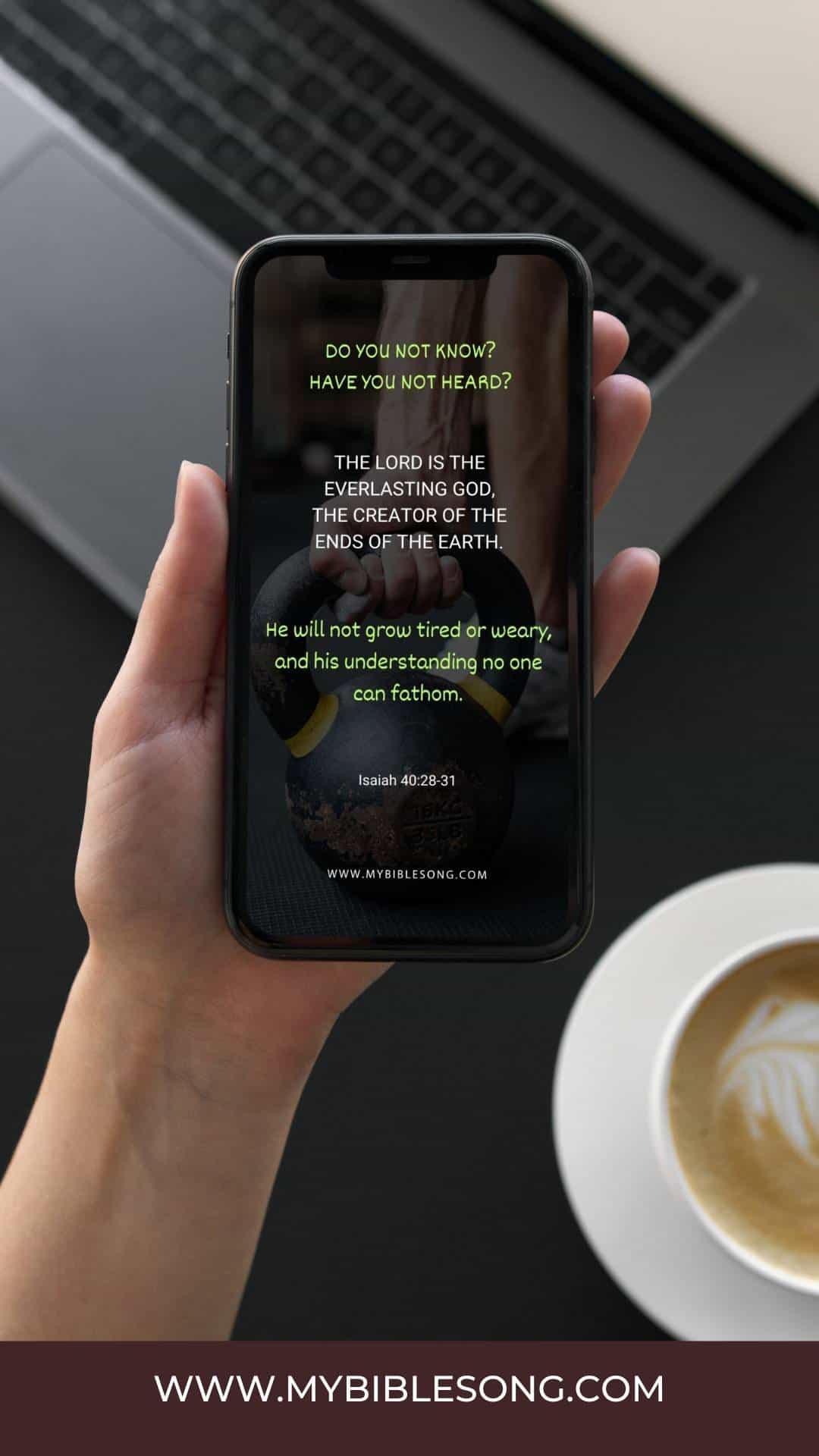 Digital Wallpaper with Bible verse Isaiah 40:28-31: “Do you not know? Have you not heard? The Lord is the everlasting God, the Creator of the ends of the earth. He will not grow tired or weary, and his understanding no one can fathom.”