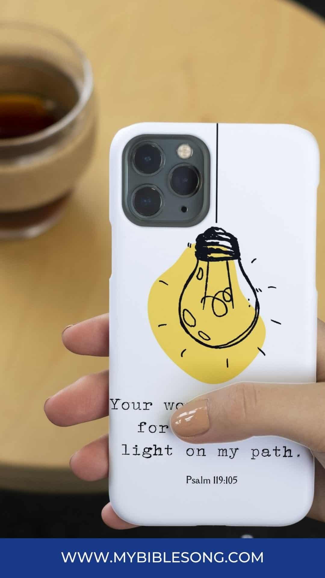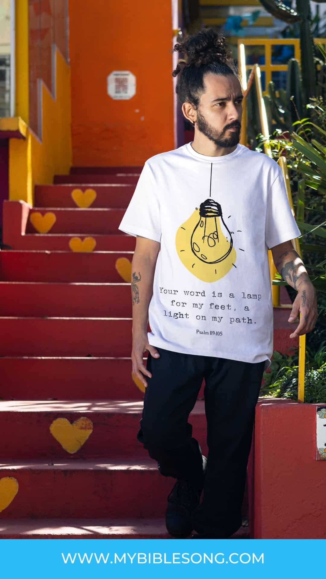 Illuminate your life with this stunning, high-res design. It features the ageless Bible verse, “Your word is a lamp for my feet, a light on my path” from Psalm 119:105. It is a timeless poem by